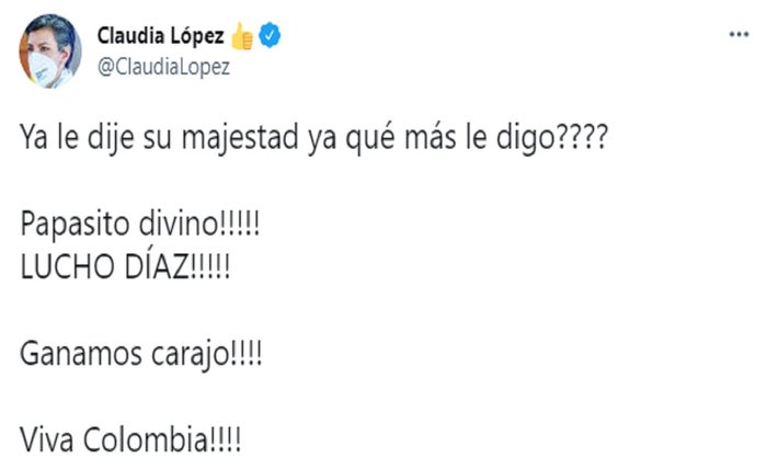 "Ya le dije su majestad ya qué más le digo ???? Papasito divino!!!!! LUCHO DÍAZ!!!!! Ganamos carajo !!!! Viva Colombia !!!!", declaró la alcaldesa en su cuenta de Twitter.