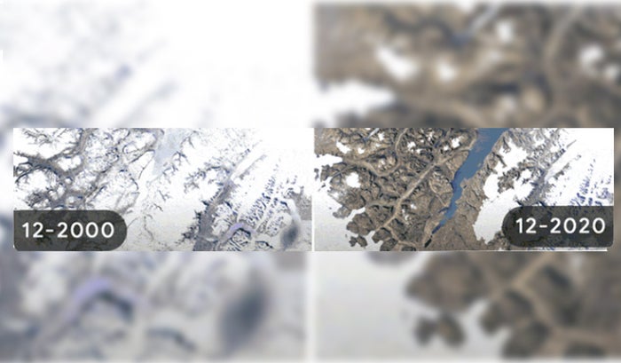Así mismo se puede ver como el cambio en la geografía en Sermersooq, Groenlandia, debido al deshielo por el calentamiento global.