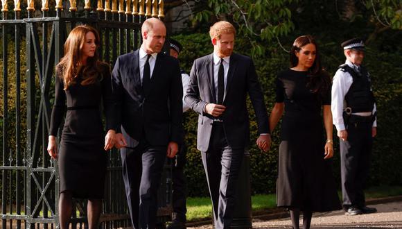 Los príncipes William (Guillermo) y Harry (Enrique) aparecieron este sábado con sus esposas Catalina y Meghan en el castillo de Windsor, donde contemplaron juntos las ofrendas florales a la reina Isabel II, fallecida el jueves.