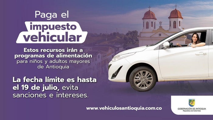 Desde la Gobernación de Antioquia hacen un llamado a los ciudadanos para que realicen el pago del impuesto vehicular y se logre destinar este recurso para el propósito de disminuir el hambre que afecta a más de dos millones de antioqueños, y universalizar y ampliar el programa de alimentación escolar que impactará a más de 430.000 niños y jóvenes de educación pública.