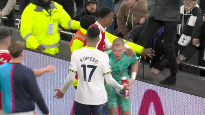 Un aficionado ubicado en uno de los fondos del Tottenham Hotspur Stadium propinó una patada al portero del Arsenal Aaron Ramsdale, al término del derbi londinense que concluyó con la victoria del conjunto de Mikel Arteta por 0-2.