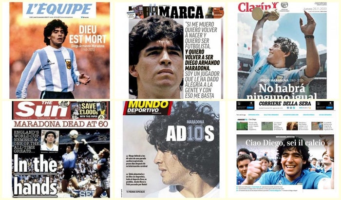 'El Mundo' se refiere al astro en su tapa como "El ídolo que tocó el cielo", En 'ABC' la portada es por completo para Maradona, con otra instantánea del mismo momento, levantando el trofeo de campeón mundial de México 1986 con la Albiceleste, y 'La Razón' titula "Adiós Diego. Maradona falleció de un paro cardiorrespiratorio un mes después de cumplir 60 años. Argentina y Nápoles lloran a su ídolo. Se va la persona, queda el mito".