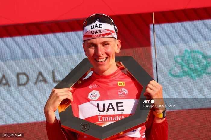 En esta llegada en alto, Pogacar, del equipo UAE, superó como el año pasado al británico Adam Yates y logró su tercer triunfo en ese lugar cercano a la frontera con Omán.