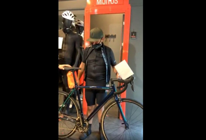 Cuando arribaron al local, el floricultor se llevó la gran sorpresa de todo lo que le tenía preparado el ciclista profesional, quien de inmediato lo dotó con uno de los uniformes de su marca, una gorra, una chaquetilla, pero el obsequio mayor una bicicleta del reconocido fabricante Cannondale.
