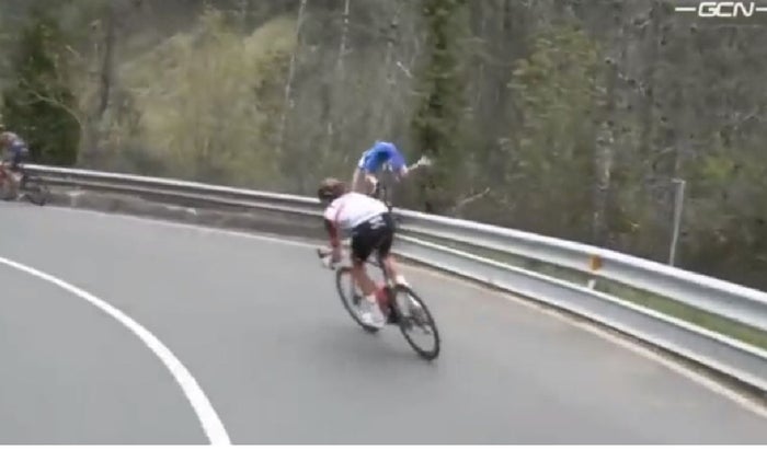 Al chocar con las vallas que limitan la carretera, el ciclista australiano dio un giro sobre su propio cuerpo y terminó en un barranco.