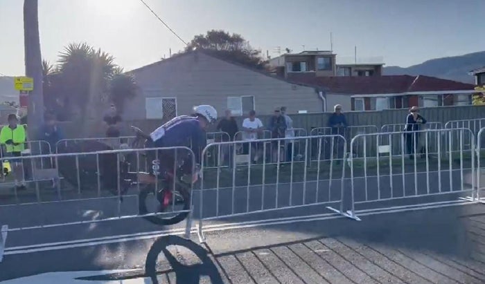El ciclista estadounidense pasó por encima de las vallas y terminó en el piso. A pesar del impacto, el corredor se repuso, volvió a la prueba y finalizó en la posición 17 a un minuto y 44 segundos del ganador.