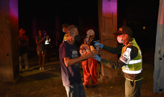 Unidades de la Policía Fiscal y Aduanera, POLFA, compartieron con 200 habitantes de calle una tasa de chocolate con pan con el fin de ayudar a este grupo poblacional que se encuentra en riesgo de contraer la pandemia.
