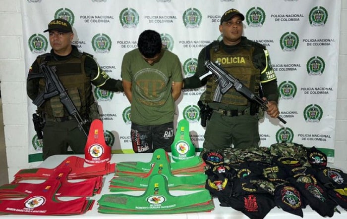 El hombre de 27 años fue sorprendido en un retén instalado por la Policía Nacional entre los municipios antioqueños de Tarazá y Caucasia, cuando llevaba en su equipaje 80 brazaletes con las siglas y el nombre de las subestructuras criminales que delinquen en el sur del departamento de Córdoba y el Bajo Cauca antioqueño. En la acción también fueron incautadas 39 pañoletas pixeladas similares a las utilizadas por el Ejército Nacional.