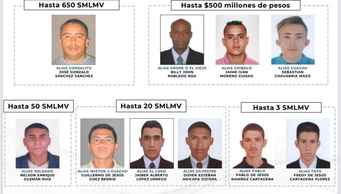 El cartel de los más buscados, en Antioquia, lo integran personas como José Gonzalo Sánchez, alias Gonzalito; Billy Jhon Robledo, alias Crone o El Viejo; Sebastián Chavarriaga, alias Guacha y Jaime Moreno, alias Chimbolo.