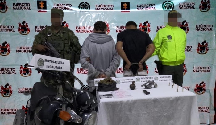 En la operación se inmovilizó una motocicleta y se incautaron 200 gramos de marihuana, tres equipos de comunicación, un arma corta, varios cartuchos calibre 38, una granada de fragmentación y una gramera. Este material y los capturados quedaron a disposición de las autoridades competentes.