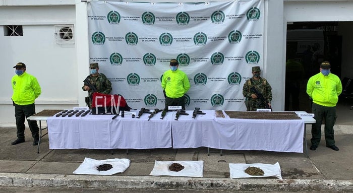 Luego de la verificación realizada por parte de las autoridades, en el lugar fueron encontrados cinco fusiles de distintos calibres, dos miras telescópicas, 14 proveedores para fusil, 1.886 cartuchos para fusil y un equipo de comunicaciones. En el mismo sitio fue encontrada una bandera del ELN.