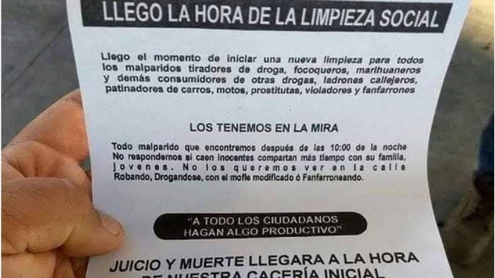 En los panfletos incautados, de acuerdo con los establecido por las autoridades, pretendían acabar de manera violenta con contra de los consumidores y expendedores de alucinógenos, ladrones y atracadores que hicieran presencia en este municipio.