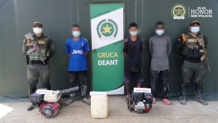 Estas detenciones fueron realizadas con ayuda de unidades caninas en la vereda Malvinas del municipio de Caucasia en el Bajo Cauca. En esta subregión del departamento, fue descubierto un complejo de extracción ilícita de oro, en el que con motores succionaban material mineral ilegal, haciendo daños considerables contra el medio ambiente.