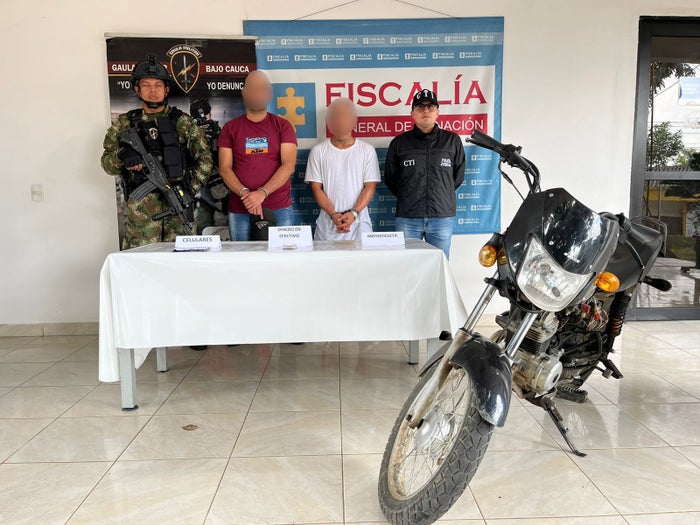 Gracias a la información recopilada por hombres del Gaula Militar Bajo Cauca se logró la ubicación de los sujetos, quienes fueron capturados mientras recibían una suma de dinero, producto de la extorsión a un comerciante del municipio de Caucasia, Antioquia.