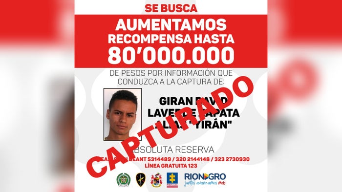 El alcalde de Rionegro, Rodrigo Hernández Alzate, reveló que sobre alias Yirán se ofrecía 80 millones de pesos por su captura y gracias a información humana suministrada, fue detenido por unidades de la Policía Antioquia.