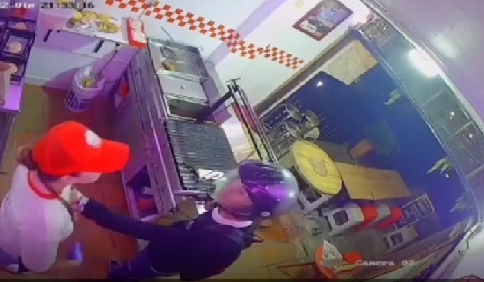 La cámara de seguridad de un negocio de comidas captó el momento en el que un hombre, con casco puesto, ingresa al lugar y con un arma de fuego intimida a dos trabajadoras.