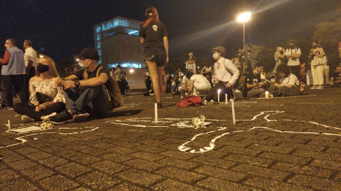 En el Parque San Antonio, Centro de Medellín, líderes sociales, activistas y jóvenes pintaron siluetas blancas en el piso por cada una de las víctimas mortales que han dejado las masacres en el país.