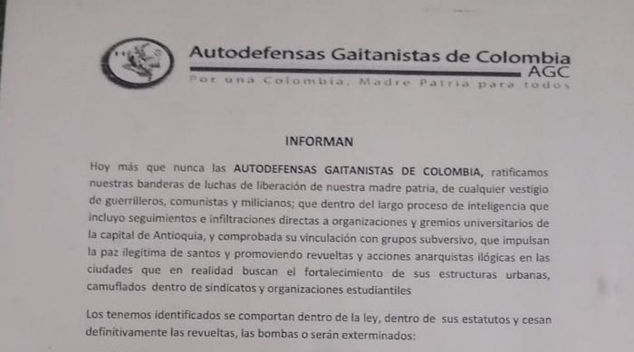 Este lunes circuló por la Universidad de Antioquia un panfleto firmado, supuestamente, por las Autodefensas Gaitanistas de Colombia, en los que se amenaza a varios estudiantes, profesores y empleados de la institución de educación superior a quienes señalan de promover “revueltas y acciones anarquistas ilógicas”.