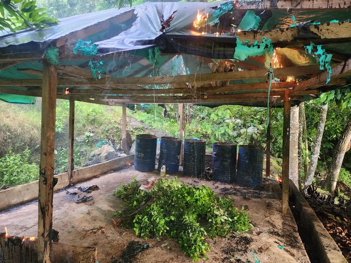 En la vereda Santa Bárbara, jurisdicción del municipio de Valdivia, Antioquia, tropas del Ejército ubicaron y destruyeron dos estructuras rústicas que albergaban en su interior 240 kilogramos de hoja de coca, 20 galones de pasta base de coca en proceso, 385 galones de gasolina, 29 canecas de ACPM, amoniaco y palas metálicas, entre otros elementos utilizados para la producción de la droga.
