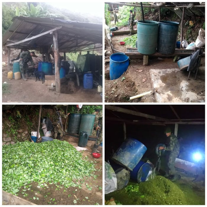 Durante el proceso de destrucción de esto cuatro laboratorios para el procesamiento de coca se incautaron 850 kilogramos de hoja de coca, 633 galones de base de coca en proceso, 130 kilogramos de insumos sólidos y 220 galones de insumos líquidos, agregó El Comandante de la cuarta brigada, brigadier general Juvenal Díaz Mateus.