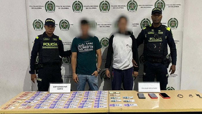 Los uniformados capturaron a los hombres, de 30 y 32 años, cuando pretendían recibir el dinero exigido. Los señalados victimarios tenían en su poder los elementos hurtados a las víctimas.