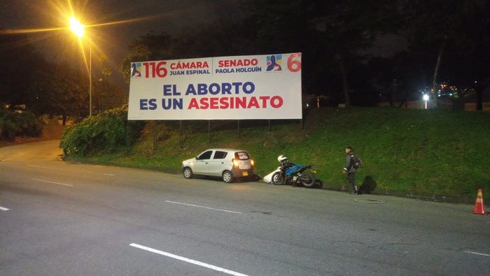En la Avenida Regional de Medellín, la senadora del Centro Democrático, Paola Holguín, y el represente a la Cámara por Antioquia, Juan Espinal, instalaron una valla tras la decisión de la Corte Constitucional de despenalizar el aborto hasta la semana 24.