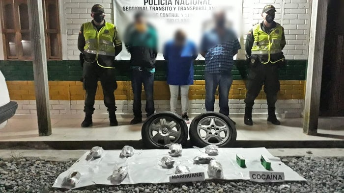 La primera incautación se presentó en el sector de Río Claro a la altura autopista Medellín-Bogotá. En ese lugar fueron sorprendidos dos hombre y una mujer, quienes dentro de la llantas de repuesto de un vehículo particular en el que movilizaban, transportaban cinco kilos de marihuana y un kilo de cocaína avaluados en 9.000.000 millones de pesos.