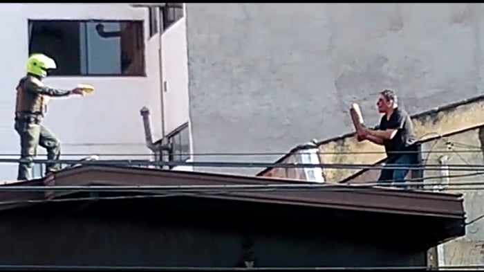 Tras la insistencia y los llamados de los funcionarios de la Fuerza Pública, para que no atentará contra su vida, este hombre con un objeto contundente en su mano, los amenazaba si estos seguían con el objetivo de calmarlo.