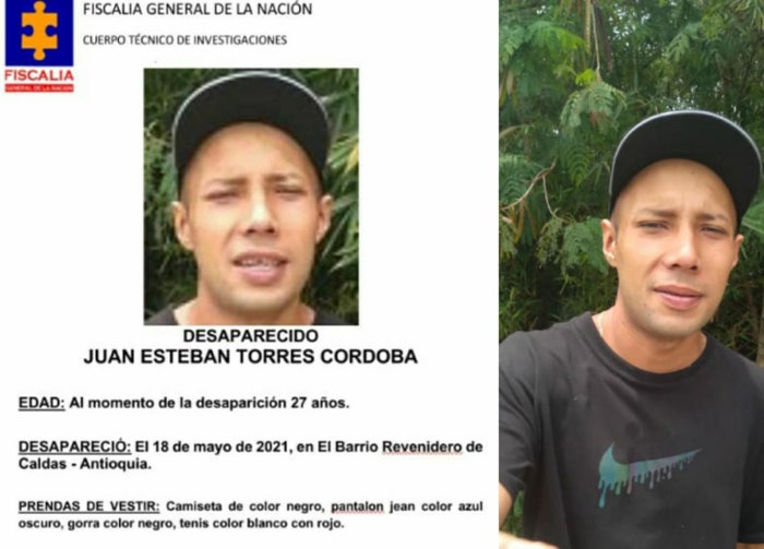 Juan Esteban Torres Córdoba, de 27 años, desapareció del barrio Revenidero de Caldas, Antioquia, el 18 de mayo de 2021. Un amigo lo vio participando en una de las marchas. Esa noche, hubo fuertes disturbios con la fuerza pública en este municipio.