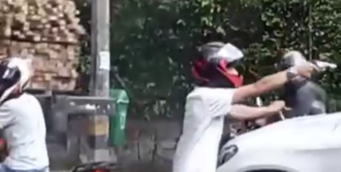 En las imágenes se puede apreciar como uno de los fleteros, quien se encuentra armado, y que se ha bajado de la moto, con su arma intimida al futbolista.