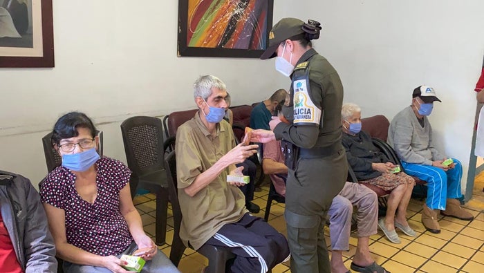 Uniformados de la Policía Fiscal y Aduanera, POLFA, entregaron mercados y elementos de aseo a por lo menos 20 adultos mayores que se encuentran en un centro geriátrico en el barrio Prado centro de Medellín.