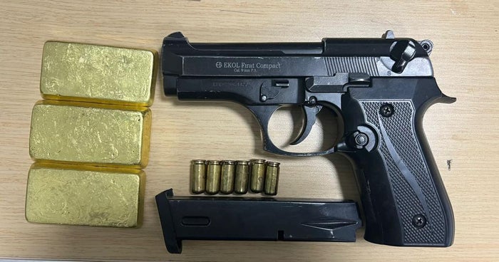 Cuando se practicó el registro personal, se le halló en su poder un arma de fuego tipo pistola 9 mm, con munición de menor letalidad, además tres bloques de oro con un peso aproximado de 1.500 gramos, avaluados en más de 400 millones de pesos, que fueron incautados por no presentar la documentación que acreditará su legal procedencia.