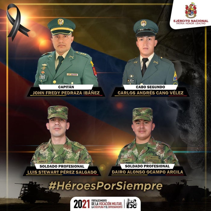 En un comunicado, el Ejército confirmó las identidades de los militares: se trata del capitán John Fredy Pedraza, el cabo segundo Andrés Cano y los soldados profesionales Dairo Ocupo Arcila y Luis Pérez.