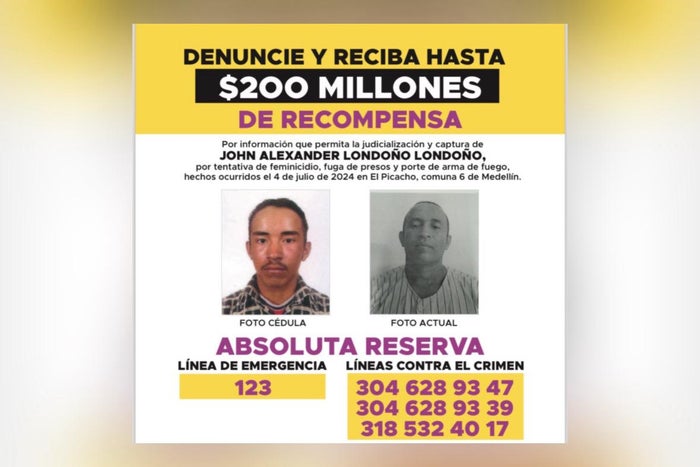 La alcaldía de Medellín ofreció una recompensa de hasta 200 millones de pesos por el la captura de Jhon Alexander Londoño Lodoño, quien, al parecer, mató de un disparo en la cabeza a su novia en medio de una discusión en el barrio >el Picacho de la comuna del 12 de Octubre