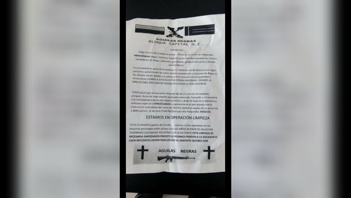El panfleto que ronda esta encabezado por un grupo que se hace llamar "Aguilas Negras Bloque Capital D.C" y en el se encuentra el siguiente escrito:
