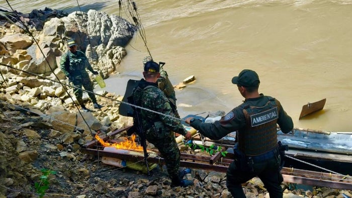 Hombres del batallón de Infantería N.º 11 Cacique Nutibara de la Cuarta Brigada del Ejército Nacional destruyeron seis unidades tipo draga que eran utilizadas para ejercer la minería ilegal en el departamento de Antioquia.