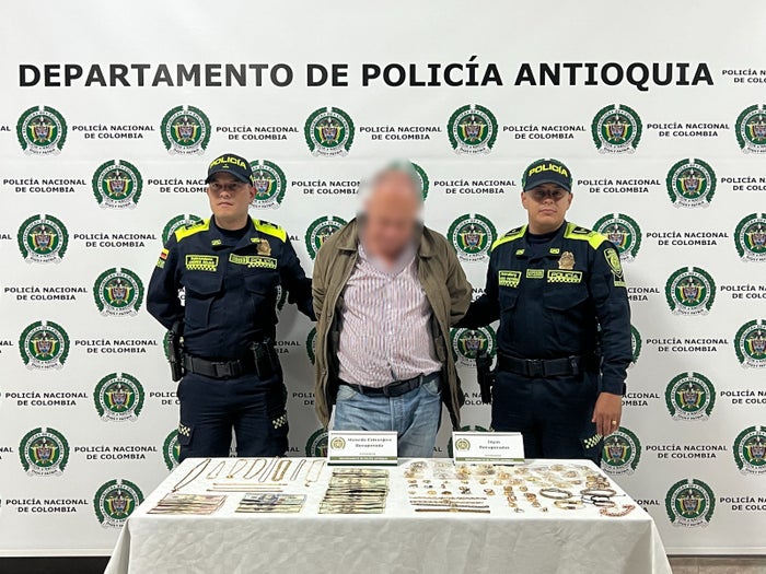 Unidades de la Seccional de Investigación Criminal (SIJIN), realizaron la captura de este hombre y recuperaron las joyas y dinero en efectivo avaluados en más de $300 millones de pesos, dijo el comandante de la policía Antioquia, coronel Oscar Mauricio Rico Guzman