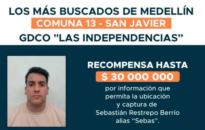 La Alcaldía de Medellín ofreció una recompensa de hasta $30 millones por información que conduzca a la captura de Sebastián Restrepo Berrío, alias "Sebas", cabecilla del Grupo Delincuencial "Las Independencias".