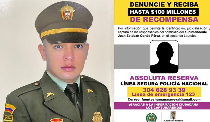 La Policía Metropolitana del Valle de Aburrá y la Alcaldía de Medellín anunciaron una recompensa de hasta 100 millones de pesos por información que permita identificar, capturar y judicializar a los responsables del homicidio del subintendente Juan Esteban Cortez Pérez.