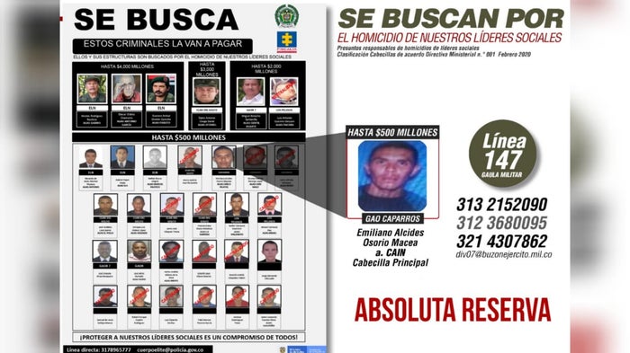Un importante anuncio hizo el Ejército en las últimas horas, al revelar que el Gobierno Nacional, elevó a 500 millones de pesos, la recompensa para quien brinde información y facilite la captura de alias Caín o Pilatos, señalado de ser el cabecilla principal de Los Caparros.