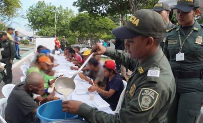 En medio de una chocolatada el grupo de prevención y educación ciudadana de la Policía Nacional, hizo la entrega de alimentos y elementos de bioseguridad a cerca de 500 personas en situación de calle en la comuna diez de la Candelaria, centro de la capital antioqueña.
