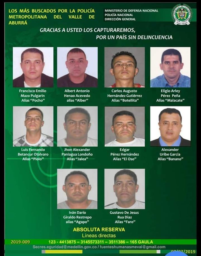 El Cartel de los más buscados lo conforman, Francisco Emilio Mazo Pulgarín, alias Pocho; Albert Antonio Henao Acevedo, alias Albert; Carlos Augusto Hernández Gutiérrez, alias Botellita; Eligio Arley Pérez Peña, alias Malacate; Luis Fernando Betancur Otálvaro, alias Piolo; Jhon Alexander Paniagua Londoño, alias Jalea; Edgar Pérez Hernández, alias El Oso; Alexander Uribe García, alias Banano; Iván Darío Giraldo Restrepo, alias Agapo y Gustavo de Jesús Rúa Díaz, alias Faro.