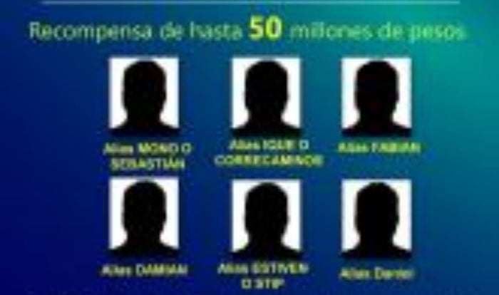 Se trata de alias Estiven o Stip, Damian, Fabián, Ique o Correcaminos, El Mono o Sebastián y alias Daniel, por los cuales se ofrece una recompensa de hasta de 50 millones pesos a quien dé información sobre su ubicación y que ayude a judicializarlos. El coronel Daniel Mazo, comandante de Policía Antioquia, confirmó que todos los señalados son integrantes del Clan del Golfo.