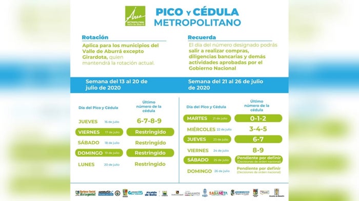 En los diez municipios del Valle de Aburrá se mantendrá la restricción del pico y cédula metropolitano, que deberá cumplirse para la compra de víveres, medicamentos o diligencias bancarias.