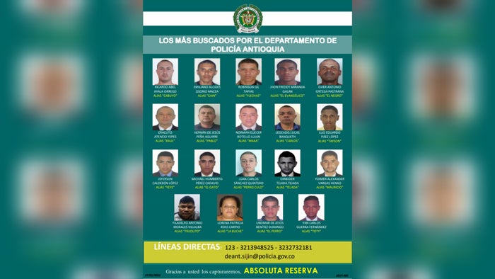 Estos son los alias de las 19 personas que hacen parte del cartel de los más buscados en Antioquia y son sindicados por las autoridades de cometer varios delitos en todas las regiones del departamento como el homicidio, desplazamiento forzado, extorsión, tráfico de estupefacientes entre otros, afectando la tranquilidad en las nueve subregiones.