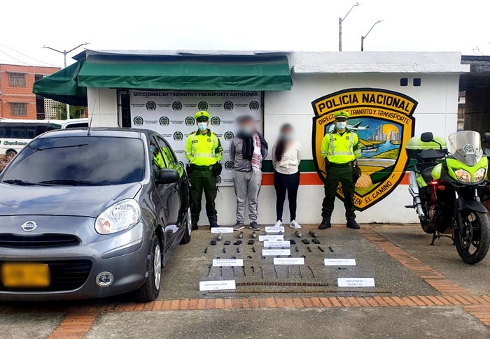 Este arsenal fue incautado por unidades de la Seccional de Tránsito y Transporte del departamento a un hombre y una mujer, quienes transportaban las armas y las municiones dentro de la caleta de un vehículo en la ruta Medellín- Montería.