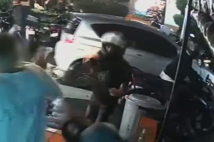En las imágenes se observa el momento en que delincuente se baja de la moto, saca su arma de fuego y le apunta a la víctima, quien en medio del susto entregó su cadena. Sin embargo, el delincuente le disparo en el ojo.