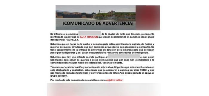 La policía investiga la circulación de un nuevo panfleto que amenaza un sector del comercio en el municipio de Bello, en el norte del Valle de Aburrá.