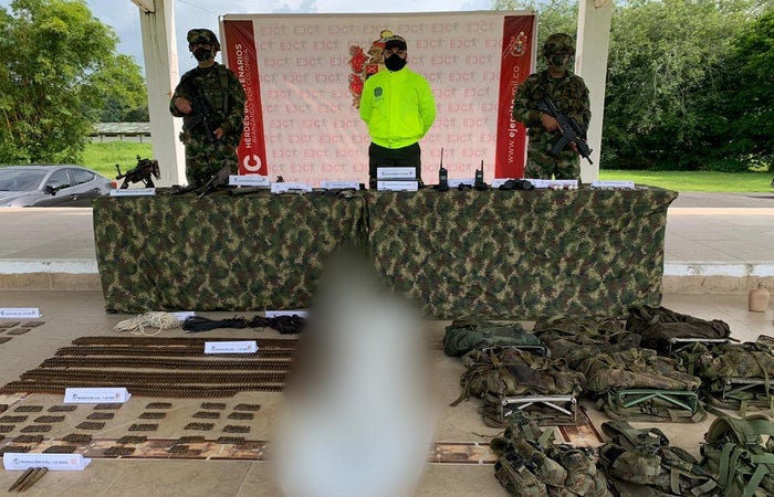 El mayor general Juan Carlos Ramírez Trujillo, comandante de la Séptima División, reveló que en el lugar fueron hallados cuatro armas largas, un arma corta, una granada, 5.430 cartuchos de diferentes calibres, ocho detonadores para armar artefactos explosivos y abundante material de intendencia y comunicaciones.