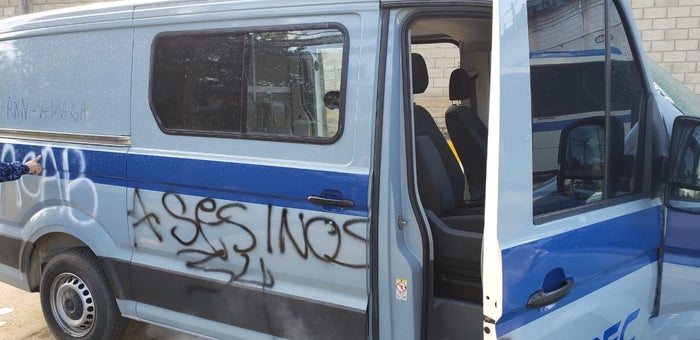 Con el mensaje “asesinos” fue rayado y atacado un vehículo del Instituto Penitenciario y Carcelario, Inpec, que transportaba a varios funcionarios durante la jornada de movilizaciones en Medellín, que terminaron en disturbios.
